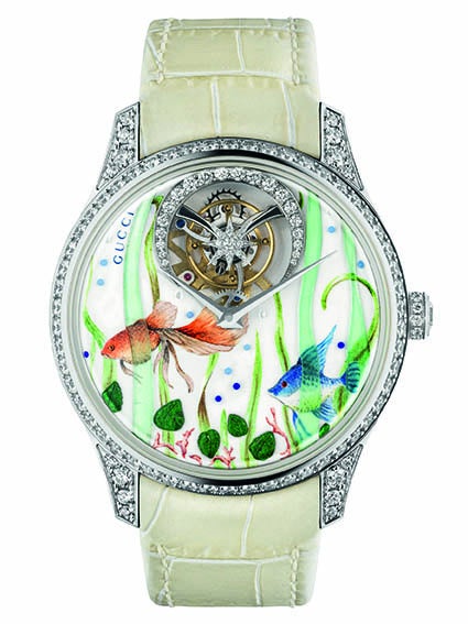 3つめのホワイトゴールド モデルは、グッチのアニマリエ(動物)シリーズのスカーフのひとつ「ペルラ」に描かれた海中の情景へのオマージュです。ダイヤモンドで縁取られたホワイトゴールドのダイアルには、ホワイトのグランフー エナメルによる光沢感を放つ背景が広がります。海の生き物たちは精密なレーザー加工の後に手描きで彩色され、さらにクリソプレーズやジェイド、ムラーノ産のヴェネチアングラスの球体がプレシャスな輝きを添えます。このモデルにはホワイトのアリゲーター ストラップを合わせました。