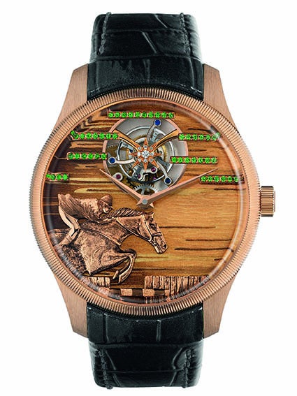 〔G-タイムレス〕コレクションの最後を飾るのは、グッチの重要なモチーフであり、シルクスカーフにもしばしば登場するテーマであるエクエストリアン(乗馬)の競技シーンをダイナミックに表現したモデルです。イタリアのオリーブウッド40ピースを用いた緻密なマルケトリー技法で仕上げたダイアルに、ハンドグレービングとハンドペイントを施したローズゴールド製の馬と騎手を配しました。表面にセットされたグラデーションカラーのツァボライトとブラックのアリゲーター ストラップが、このローズゴールドのウォッチに息づく躍動感と力強さをさらに際立たせます。