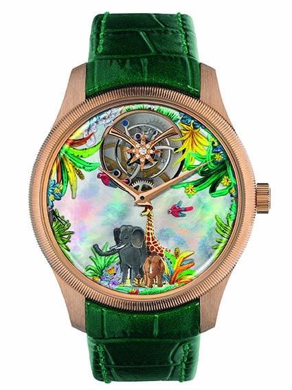 また、アッコルネロによる1969年のサファリ プリントにインスピレーションを得たローズゴールド モデルもあります。レーザーエングレービングを施したマザー・オブ・パールのダイアルには、熟練した細密画家の手でサバンナの風景や野生動物が生き生きと描かれています。このデザインには、グリーンのアリゲーター ストラップを合わせています。