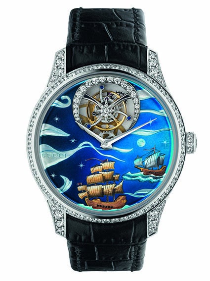 2つめのホワイトゴールド モデルは、アッコルネロによるノーティカル(航海)をテーマにしたスカーフのデザイン「ヴェリエリ」からインスピレーションを得ています。海の詩情を表現したこのウォッチは、彫刻とエアブラシで仕上げたマザー・オブ・パールのダイアルには、手描きとハンドグレービングによるさまざまな海のモチーフを散りばめ、ダイヤモンドをあしらいました。2隻の帆船は高精細のマルケトリー技法を採用、大きな船は28個のウッドピース、小さい船は12個のウッドピースで構成され、どちらもゴールドの立体的な大砲がアクセントを添えます。さらに夜光塗料で描かれた星、月、GUCCI ロゴが幻想的な雰囲気をプラスするデザインに、ブラックのアリゲーター ストラップを合わせています。