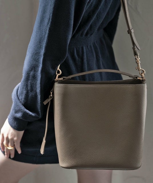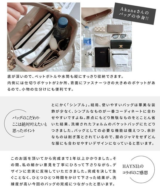 Akaneさんの「荷物がたくさん入り、かつエレガントな雰囲気で持てるバッグがあったらいいな」という想いから実現。パリの街で使い込まれたショルダーバッグを肩にかけて颯爽と歩く女性たちからインスピレーションを受け、毎日使えるサイズ感の素敵なショルダーバッグを目指しました。1年以上の開発期間を経て、「とにかくシンプル」をコンセプトに無駄なものをとことん省いた、洗練されたバケットバッグが完成しました。
