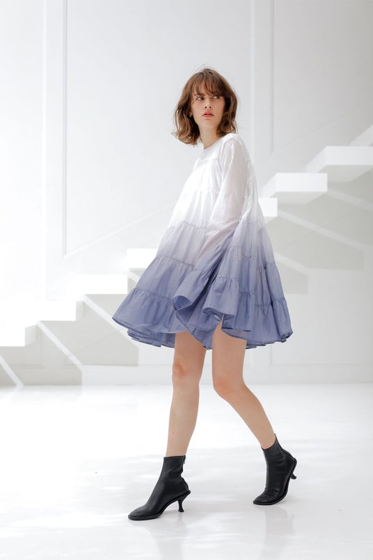 定番ティアードドレスSOLIMANに美しいブルーのグラデーションをあしらったSOLIMAN OMBRE DRESSが初登場。ホワイトからブルーに染められた幻想的なグラデーションが夢のような着心地を演出。動くたびにドラマティックに広がるティアードがあいまって、これまでにない高揚感をもたらす特別な逸品です。