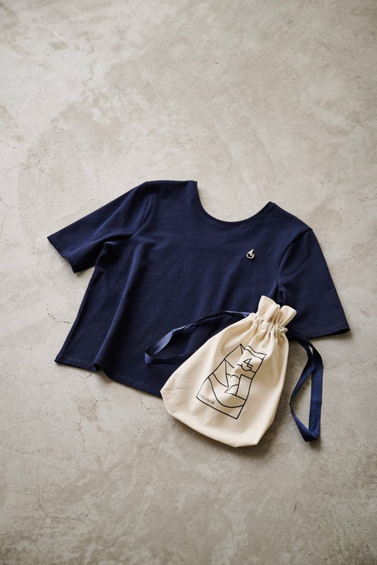 45周年のマークをピンバッジに、5分袖丈のシンプルなTシャツを展開。丸襟とVネックの前後2WAY仕様。程よいフィット感で、1枚でも、ジャケットのINにも活躍します。オリジナルの巾着に入っているのもポイントです。