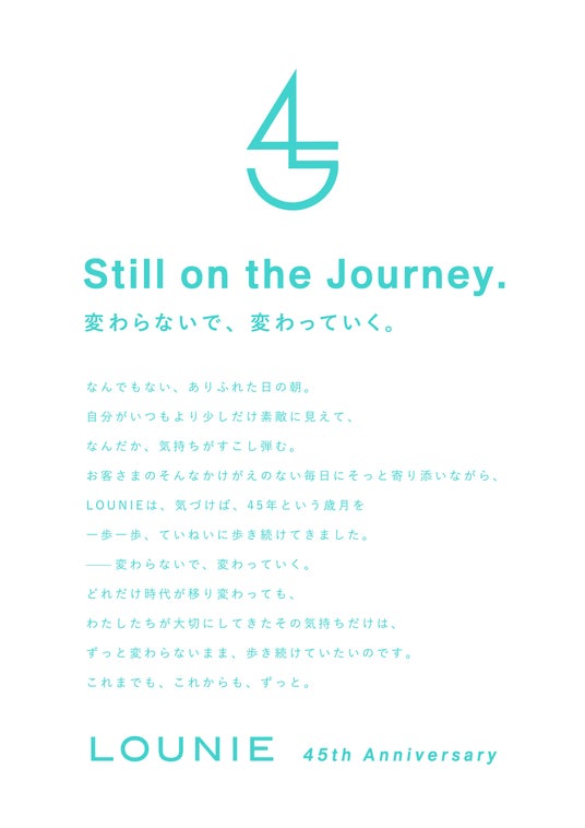 公式オンラインストア45周年特設サイトのほか、全国のLOUNIEショップにも掲出します。Still on the Journey