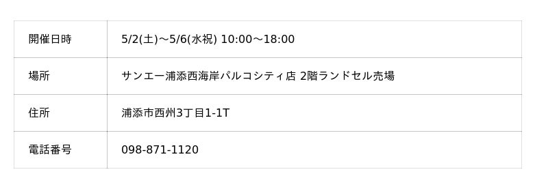 ランドセルの企画・販売を行うCHIKYU株式会社(東京都港区、代表取締役:辻谷安央)は、沖縄・サンエー浦添西海岸パルコシティ店での「2027年 サンエーのランドセル新作販売会」に参加いたします。