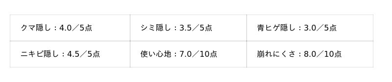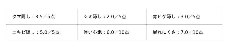 伸びのよさはいちばんで、簡単に塗れて使い心地は高評価。細かなシワがあるクマに塗っても粉っぽくならずうまく隠せました。シミ・ニキビにも留まってよく隠れました。崩れやすい点が残念。