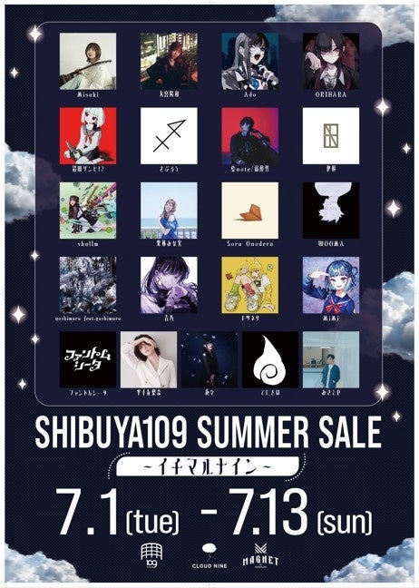 株式会社SHIBUYA109エンタテイメント(本社:東京都渋谷区、代表取締役社長:石川あゆみ)と、Adoなどインターネット出身のアーティストを多くマネージメントする株式会社クラウドナイン(本社:東京都新宿区、代表取締役社長:千木良卓也)は東京・渋谷の「SHIBUYA109渋谷店」「MAGNET by SHIBUYA109」、及び「SHIBUYA109阿倍野店」(大阪府大阪市)にて、7月1日(火)~7月13日(日)まで開催する夏セール『SHIBUYA109 SUMMER SALE ~イチマルナイン~』でコラボレーションすることが決定。