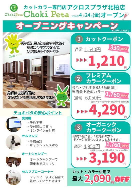 美容室チェーンを約370店舗展開する株式会社アルテジェネシス(横浜市中区/代表取締役社長 吉村 栄義)のグループ会社である株式会社C&P(横浜市中区/代表取締役社長 高橋 篤)は、チョキペタ アクロスプラザ北柏店を2026年4月24日(金)にオープンいたします。