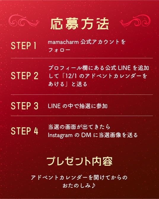 ママチャームの公式Instagramをフォローし、公式LINEを追加。公式LINEにキーワードを送信するとLINEの中で抽選に参加できます!当選の画面が出たら、InstagramのDMに当選画像を送ると素敵なプレゼントがもらえるスペシャルなキャンペーン。プレゼントの内容は各週で異なり、クリスマスまでに豪華な4種類のプレゼントをゲットできるチャンスです!