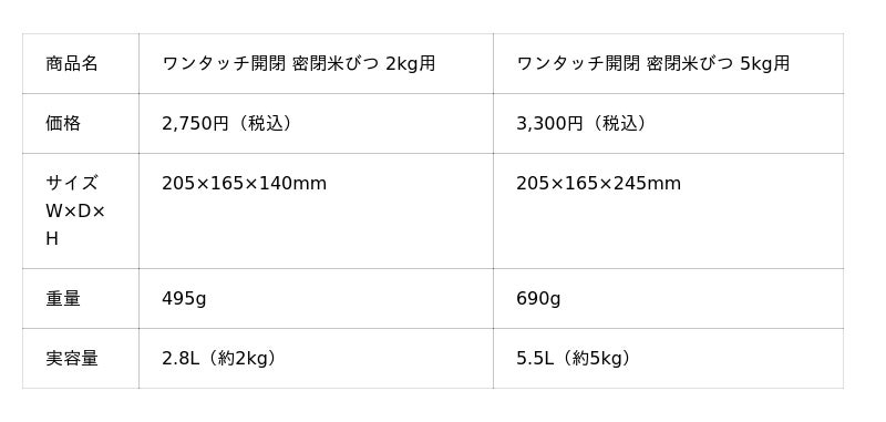 5kg用:3~4人家族や、まとめ買い派の方に。5kgのお米がそのまますっきり収まる大容量サイズ。