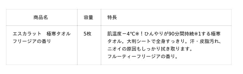 近年の酷暑によるクール商品の需要拡大により制汗剤市場は大きく成長しています。それに伴い、『エスカラット』シリーズも「極寒タオル」を中心に実績を拡大しています。引き続き予想される今夏の厳しい酷暑に向けて、個包装タイプの『エスカラット 極寒タオル』からフルーティーフリージアの香りと、周りを気にせずさっと塗れるロールオンタイプを数量限定で発売します。