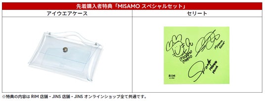 さらに、RIM全店舗とJINSの一部店舗、JINSオンラインショップにて、MISAMOがコンセプトフィルムで着用した対象商品をご購入いただいた方に先着で、オリジナルのアイウエアケースとセリートをプレゼントする「RIM loves MISAMO MUST BUY CAMPAIGN」を開始いたします。
