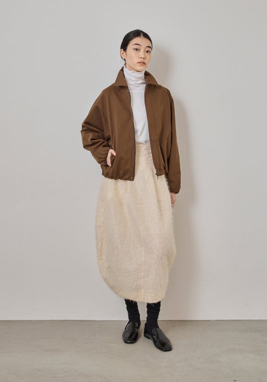軽さのある素材を、シャープな襟元とクロップド丈で構築したジャケット。ミニマルな表情に、裾のギャザーがほのかな丸みとリズムを添えます。クロップド丈ならではのバランスの良さが、どんな装いにもすっと馴染み、大人のカジュアルに取り入れやすい、頼れる一着です。