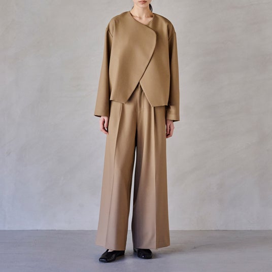余分な装飾を排し、フォルムの美しさだけを際立たせたミニマルなセットアップ。ノーカラージャケットは、滑らかに重なるフロントラインが静かな強さを感じさせ、パンツはセンタープレスが描く直線が凛とした佇まいを生みます。ほどよい落ち感が体を包み込み、シルエットを計算されたままに整えてくれるのも魅力。フォーマルにもデイリーにも品よく馴染む、ワードローブの“軸”になるセットです。