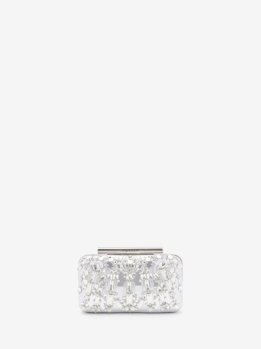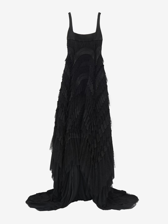 2025年秋冬コレクションより、ブラックのオーガンザ製プリーツ イブニングドレス、シルクジョーゼットのラッフルカラー、クリスタルミラー装飾をあしらったシルバーのTバー ボックスクラッチを合わせています。