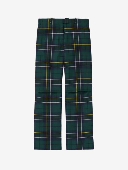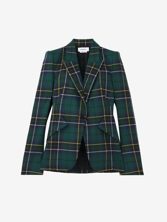 2025年秋冬プレコレクションより、ウール タータン ピークショルダー ジャケット、スリーブレス ウール タータン トップ、ウール タータン パンツ合わせています。