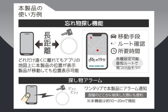 特徴:落とし物、探し物が多い方必見!ついにiPhoneとAndroid両OS対応のサーチタグ登場!サーチタグを付けた鍵や鞄を地図上に位置表示。各専用のアプリを使用して離れた場所から位置を探知できます。子どもの迷子対策に!車両の隙間にサッと入るので、愛車の盗難対策におすすめ!