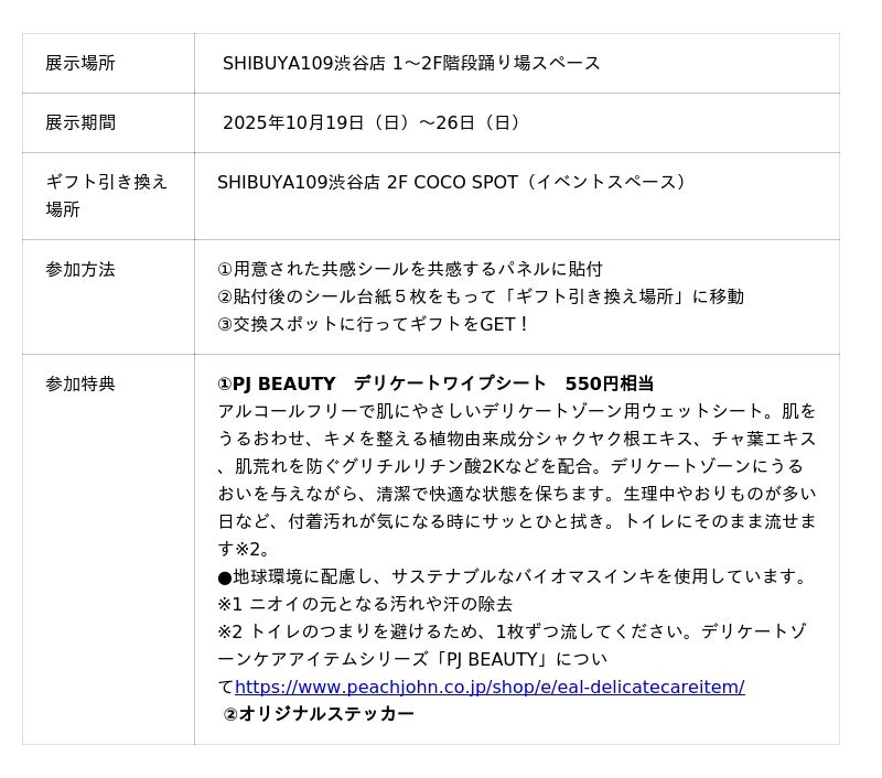 なお、10月19日の展示初日は、アイコンシールをつかって寄せられた「声」パネルにリアクションできます。アイコンシールを5枚貼付した方にピーチ・ジョン「デリケートワイプシート」をプレゼントします。ぜひお越しください。