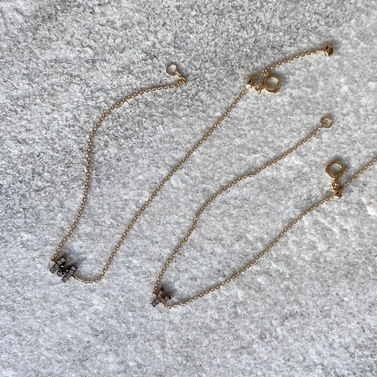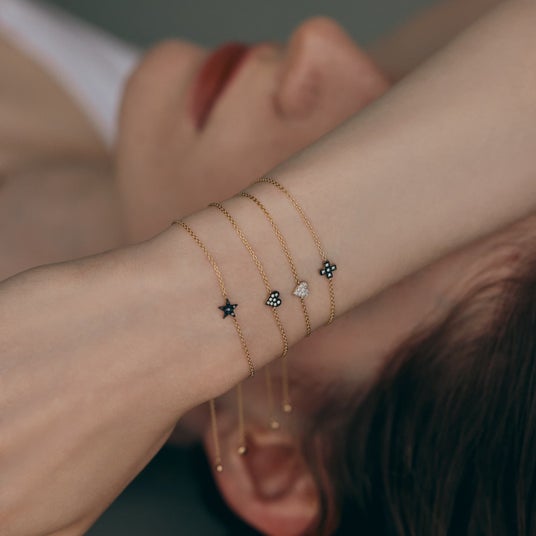 首筋や指の側面にさりげなくあしらわれた極小サイズのタトゥーを、天然ブラウンダイヤモンドで表現したジュエリー。