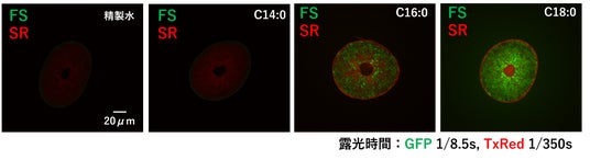 図2:カチオン性界面活性剤のアルキル鎖長の違いによる染色の蛍光パターンの差