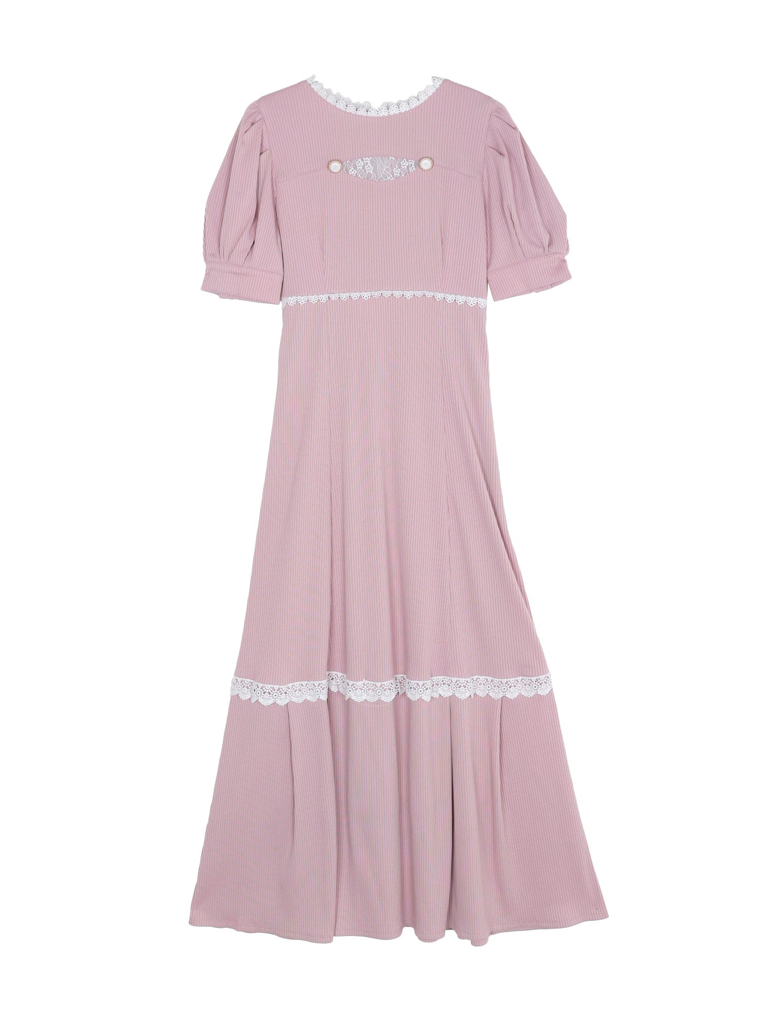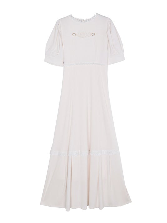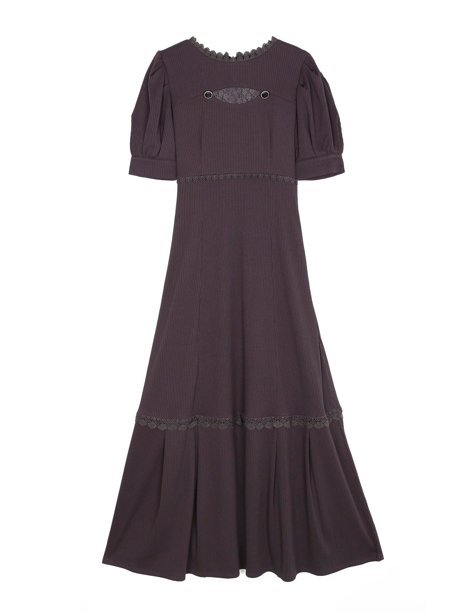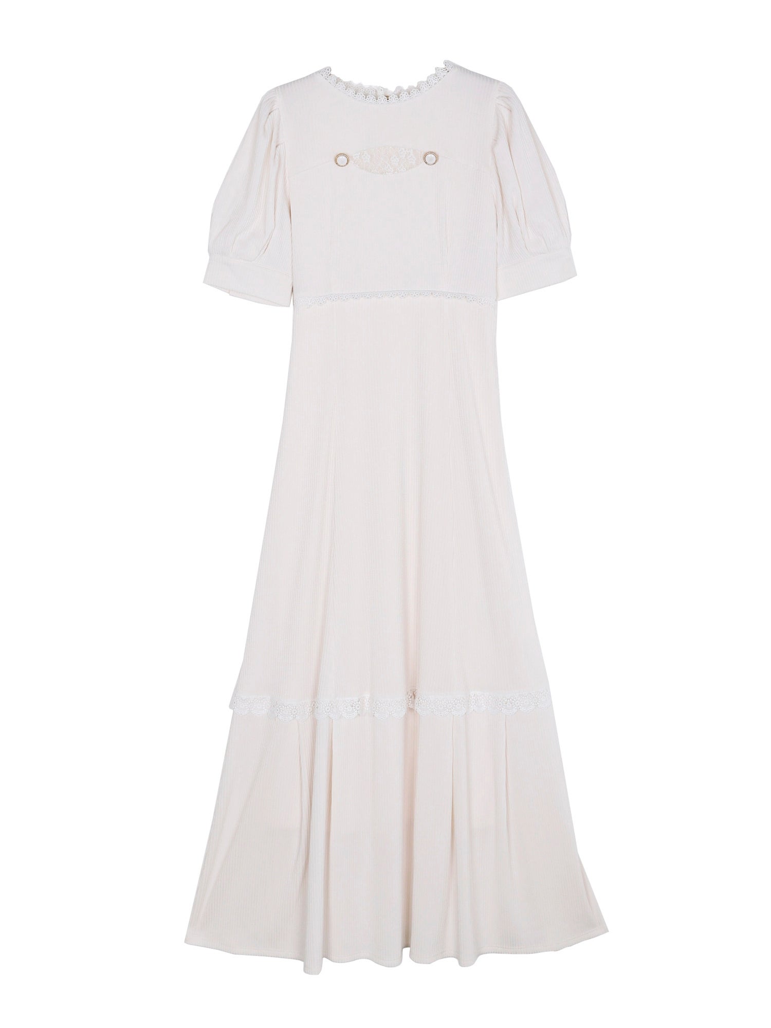 襟まわりと切り替え部分に繊細なレースをあしらい、クラシックな可憐さをプラス。