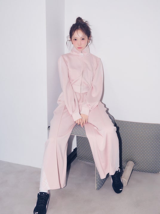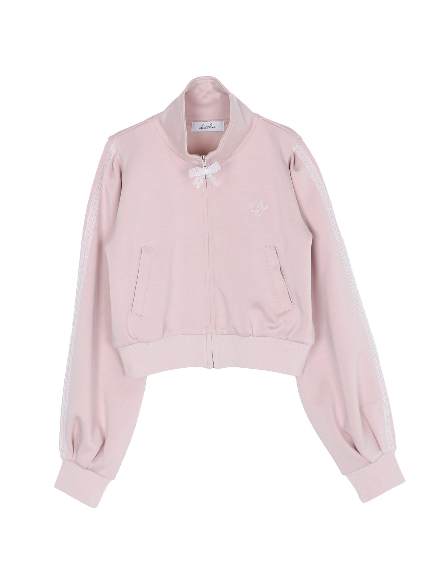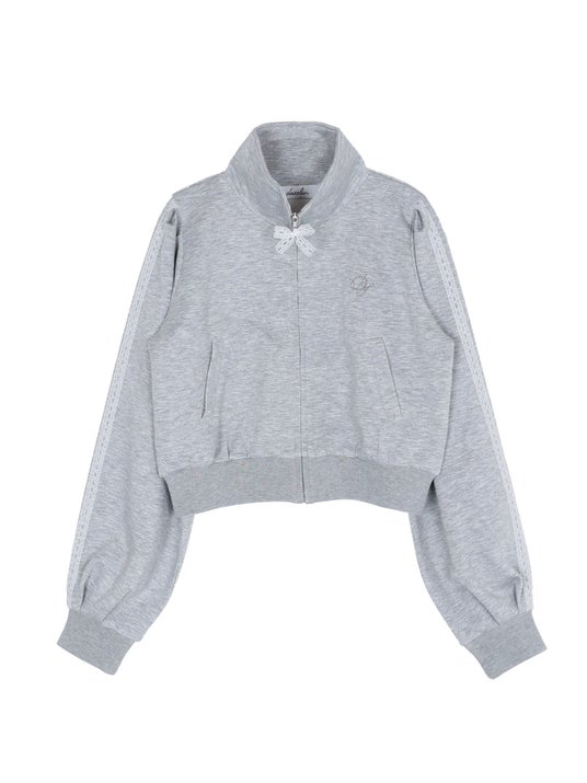 “ラフすぎないスウェット”をテーマに、袖のレースラインとファスナーのリボンでほんのりと甘さを加え、カジュアルガーリーなスタイルが叶えます。