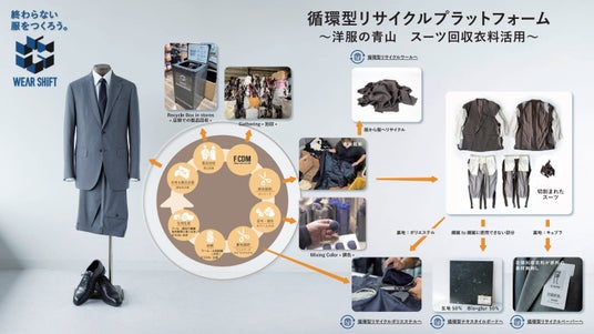 青山商事株式会社(本社:広島県福山市/代表取締役社長:遠藤 泰三)は、持続可能なファッションの実現を目指す「WEAR SHiFT(ウエアシフト)」プロジェクトの一環として、お客様から店頭で回収したスーツ(裏地など)のポリエステルを再利用した「ウエアシフトスーツ」を、4月14日(火)より洋服の青山全店および、公式オンラインストアで発売します。