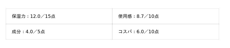 ベストバイと同じシリーズで、ベタつきや皮脂トラブルが気になる人向けの製品。保湿力はベストバイ同様高い数値を記録しましたが、使用感はモニター全員が「サラッとしている」と軽いつけ心地を実感しました。