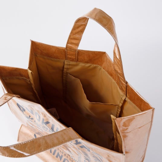 内側は、紙袋のような風合いの素材で、雑誌やノートPCもすっぽり収まるサイズ感で、収納力も抜群です。内ポケット付きで、鍵やカードケースなどの小物もすっきり整理。必要なものをすぐに取り出せる使いやすさが魅力です。