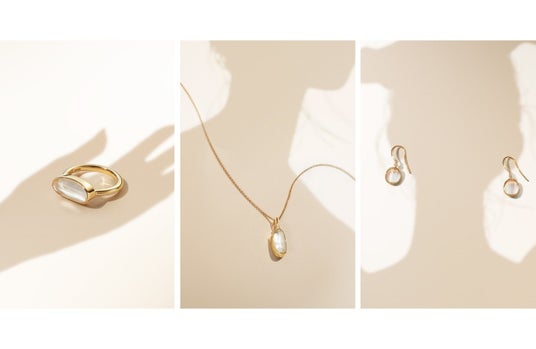 涼やかな印象を与える透明感が魅力のクォーツに、大胆なラインのカッティングを施した主役級のジュエリーが登場。ネックレスは、チェーンとストーンの間にダイヤモンドの輝きをプラスし、夏の陽射しを受けてきらめく海岸の情景を思わせるデザインに。サークルカットが大人の愛らしさを放つネックレスやリング、動きに合わせてゆらゆらと揺れるピアスも揃います。印象的なカッティングながら、モダンでシンプルなデザインが夏のコーディネートになじみます。
