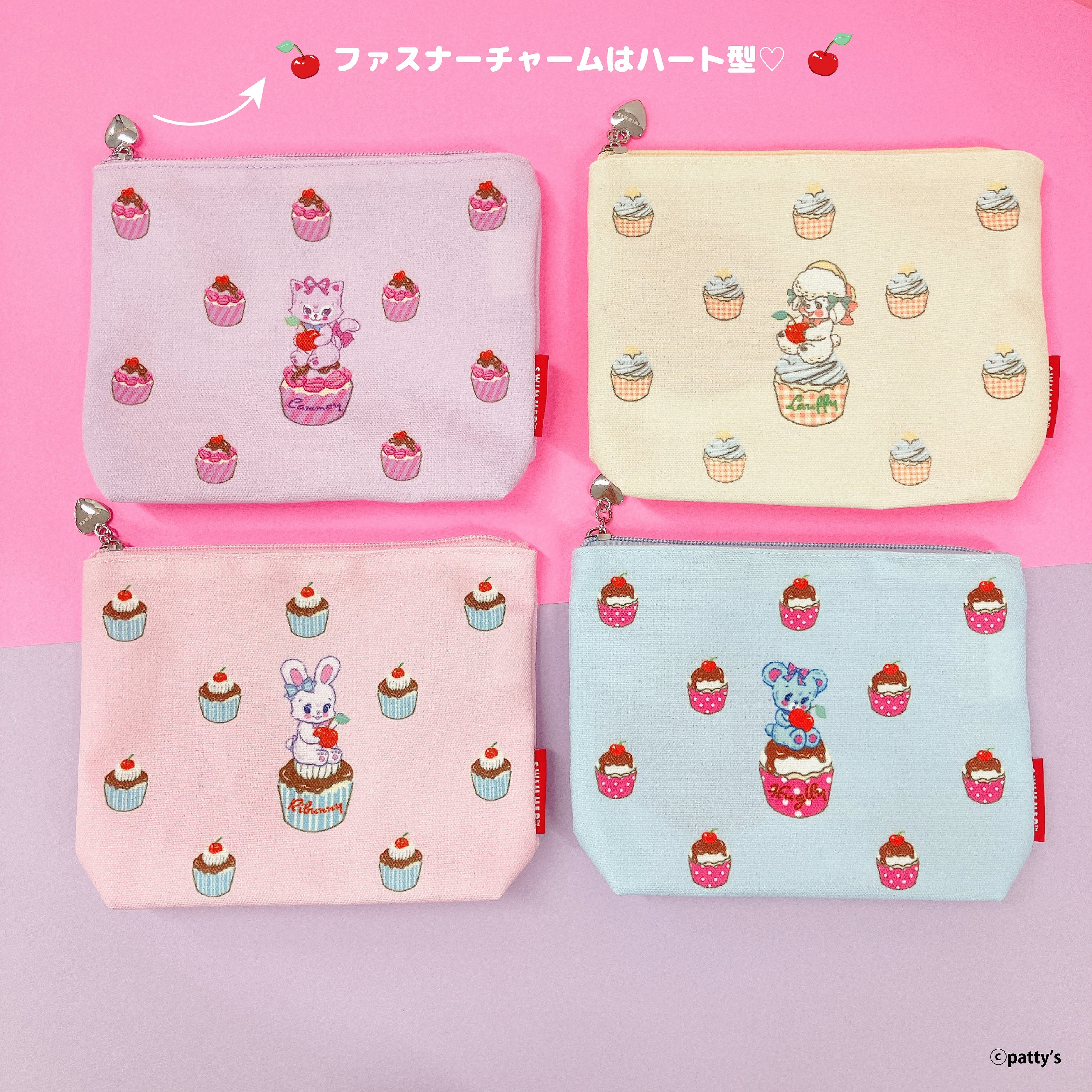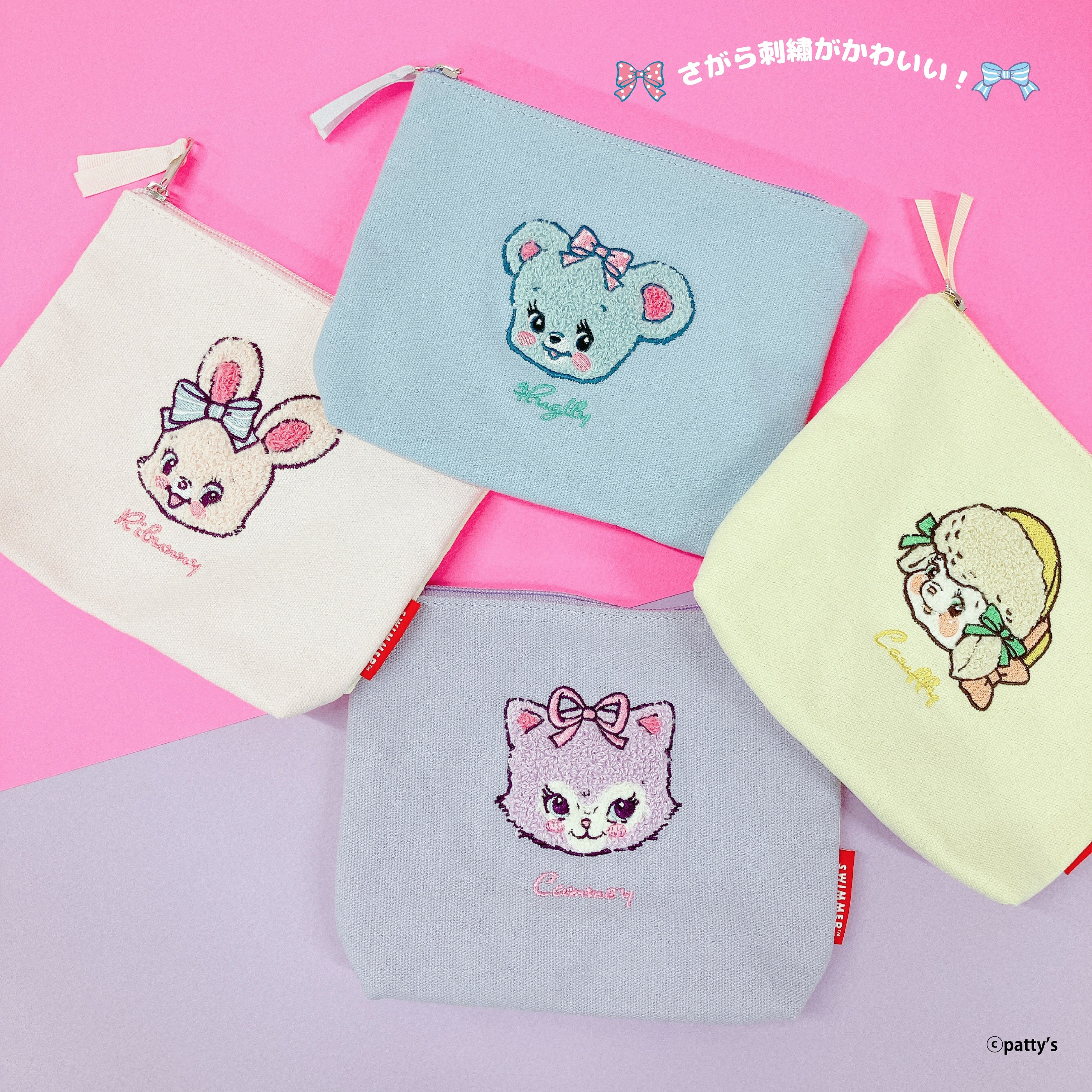 ■サガラ刺繍ポーチ:1,780円(税込)SWIMMERの人気キャラクター、くまの「ハグリー」、ねこの「キャミー」、うさぎの「リバニー」、ひつじの「ラッフィー」たちのサガラ刺繍がとってもかわいい(ハート)キャラのお名前刺繍入り!