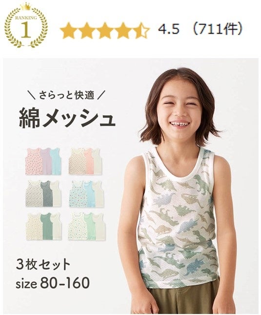 ベビー服にも使われている安心な綿100%メッシュで風通りもよくサラっと快適、暑がりな子にもピッタリです。私自身、子ども3人分を何度もリピート購入している園生活の必需品です。