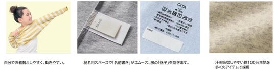毎日洗濯しても型崩れしにくい生地や、子どもの汗をしっかり吸収する綿100%生地を採用するなど、アイテムに合わせて実用性の高い素材を使用しています。
