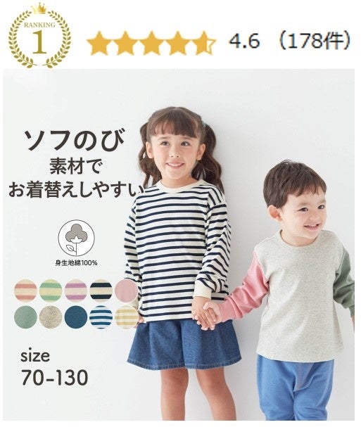 お気に入り商品はトップス部門1位の「お着替えしやすいソフのびフライス長袖Tシャツ」です。ソフのびシリーズは、子どもがまだ小さいころ、ご機嫌に一人で着替えてくれるので、忙しい朝にとても助かりました。