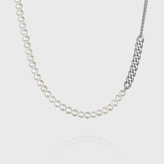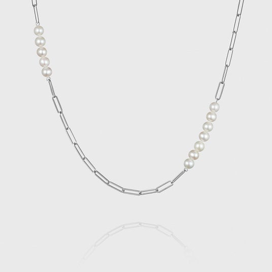 タイプ別で選べるパールネックレスが、2種類のデザインバリエーションで登場。連なるパールと存在感のあるチェーンとのミックスが、ジェンダーレスなムードを演出。ホワイトパールの柔らかな光沢と、プラチナコーティングの上質な艶が、大人の落ち着きを引き立てます。