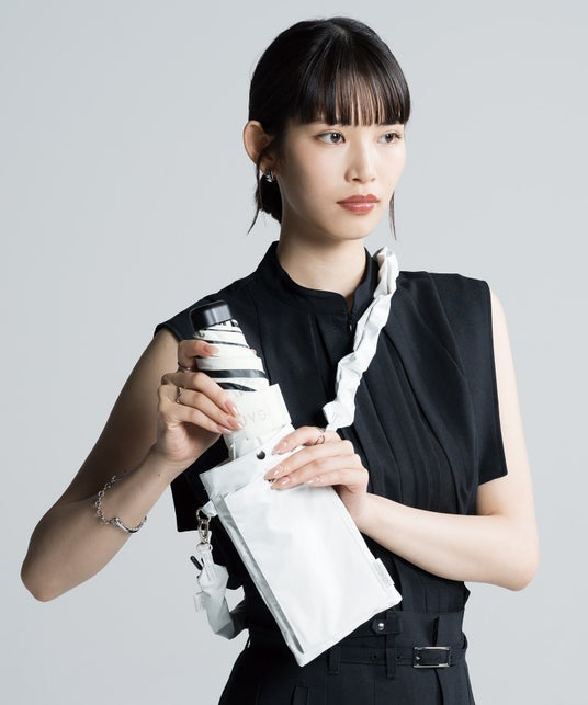 いつでも手軽に紫外線対策が可能な、ショルダーポシェット付きの折りたたみ傘。