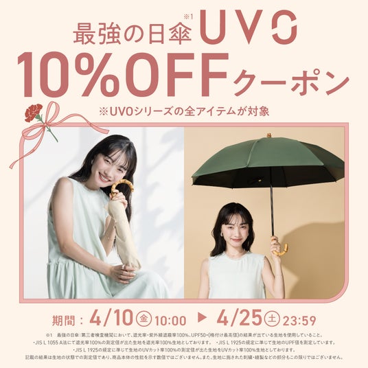 公式オンラインストアでは、母の日特別企画としてUVO全アイテム10%OFFクーポンを配布しております。感謝の気持ちと一緒にUVOを贈ってみてはいかがですか?