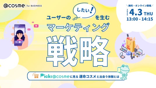 株式会社アイスタイル(代表取締役社長:遠藤 宗)は、2025年4月3日(木)に、ウェビナーイベント『新施策『Picks @cosme』に見るユーザーの「○○したい!」を生むマーケティング戦略』を開催することをお知らせいたします。