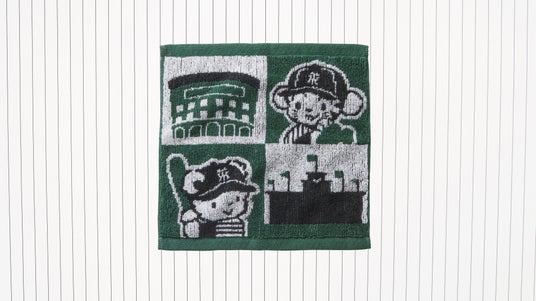 ファミちゃんとトラッキーが大きくデザインされたジャガード柄ハンカチ。阪神甲子園球場を連想させるカラーで、試合観戦にもおすすめです。