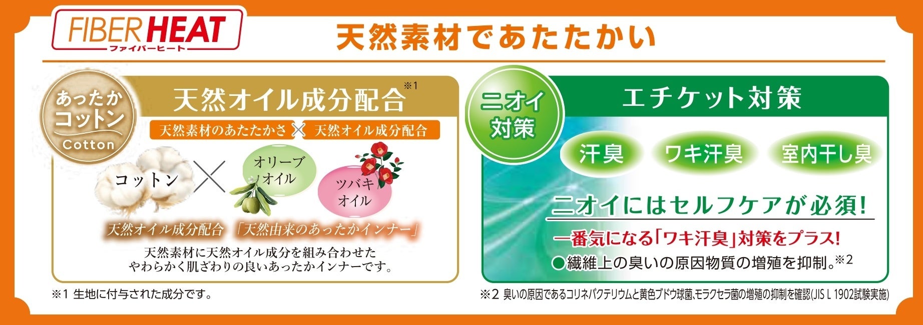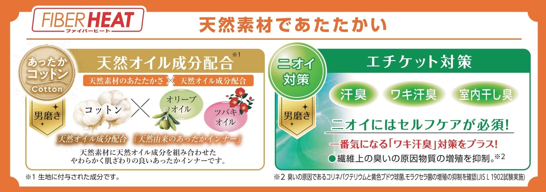 天然素材の綿に「天然オイル成分」を配合し、暖かさに加えてやわらかく肌ざわりの良いインナーです。あったかモイストインナー同様に、今年は新たに「ワキ汗臭」対策をプラスし、ニオイ対策も進化しました。さらに、環境に優しいオーガニックコットンを使用しています。●メンズインナーのラインナップ