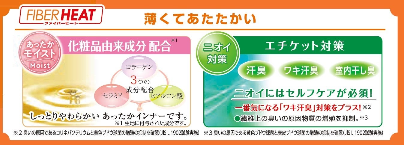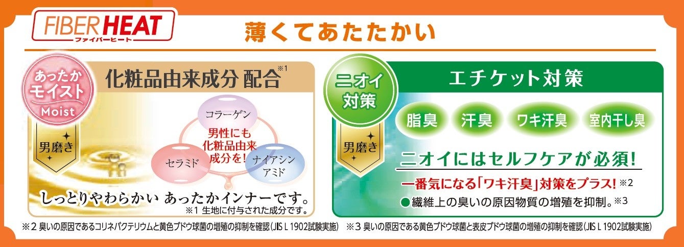 生地が薄くても暖かく、「化粧品由来成分」を配合することでしっとりやわらかく、保湿性のあるインナーです。今年は新たに、多くのお客様が気にされる「ワキ汗臭」対策をプラスし、ニオイ対策も進化しました。 さらに、環境に配慮したレーヨン繊維を使用しています。●メンズインナーのラインナップ