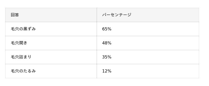 - 毛穴に関する悩みについて、「毛穴の黒ずみ」という回答が最も多い