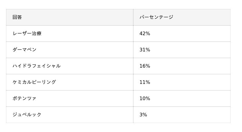 毛穴治療の種類について、「レーザー治療」を行った人が最も多く、続いて「ダーマペン」という結果でした。ポテンツァやハイドラフェイシャルと比べて安く受けられるという特徴があります。