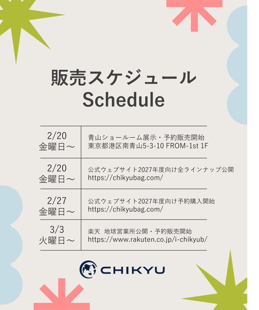 ランドセルの企画・販売を行うCHIKYU株式会社(東京都港区、代表取締役:辻谷安央)は、2月より順次2027年春ご入学のお子さま向け最新ランドセルを公開・予約販売を開始いたします。