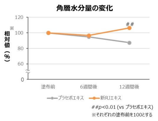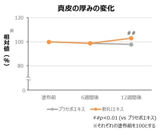 新RJエキスを塗布した側では、プラセボを塗布した側と比較して、角層水分量が増加し、真皮の厚みが向上した。このことから、新RJエキス は、表皮と真皮の両方に働きかける可能性が示された。
