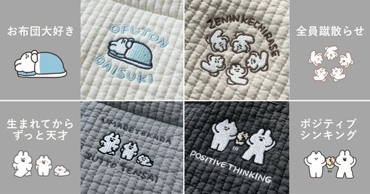 『口の悪いうさちゃん』の刺繡は全部で4種類です。(お布団大好き・全員蹴散らせ・生まれてからずっと天才・ポジティブシンキング)刺繡のセリフをローマ字表記にすることで、ヌビバッグのデザインを邪魔せず、日常に取り入れやすいよう工夫しました。