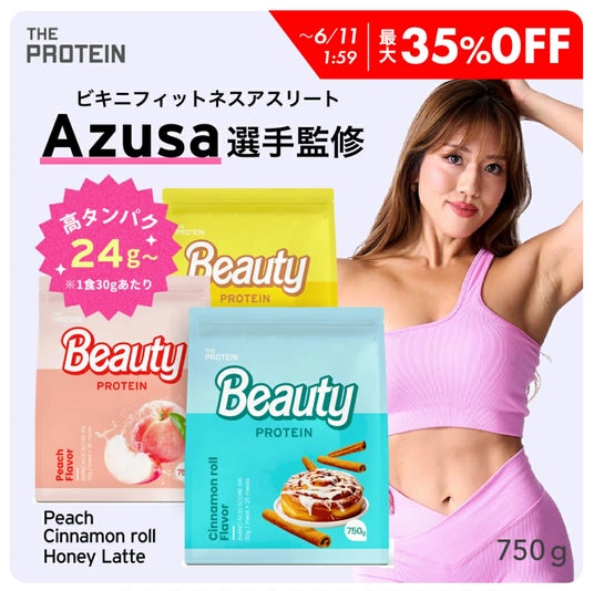ビキニフィットネスアーティストのAZUSA選手監修のBEAUTY PROTEIN!ハニーラテ風味、シナモンロール風味、ピーチ風味の全3フレーバー展開。タンパク質24g以上、11種類のビタミン、食物繊維、鉄分を配合!女性におすすめなプロテインです!