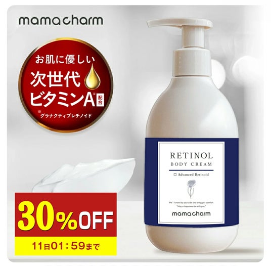 ママさんから人気を誇るライフ・スキン・ボディケアグッズを展開するブランドmamacharmのレチノママクリーム!「肌に優しい次世代レチノール」グラナクティブレチノイド*配合。優しい柑橘の香りでリフレッシュできます。