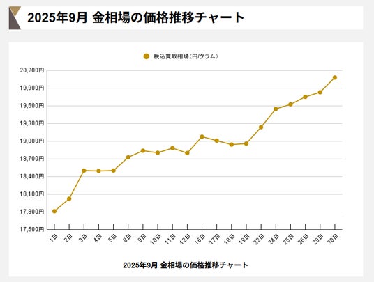 令和7年9月の金相場は1gあたり17,809円でスタート。米連邦公開市場委員会(FOMC)による追加利下げ期待から9/1の初日から前日比で+192円を記録。7月23日以来の史上最高価格となりました。その後も僅か1週間で900円以上の伸びをみせると、9/16には買取価格19,000円を突破。中東情勢やウクライナ戦争による地政学リスク、再びの円安傾向、米政府機関の一部閉鎖など様々な要因を重ねた結果、9/30の最終日は1gあたり20,000円を突破。テレビやインターネットにて大々的に報道されました。
