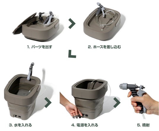 「1. パーツを出す → 2. ホースを差し込む → 3. 水を入れる → 4. 電源を入れる → 5. 噴射」